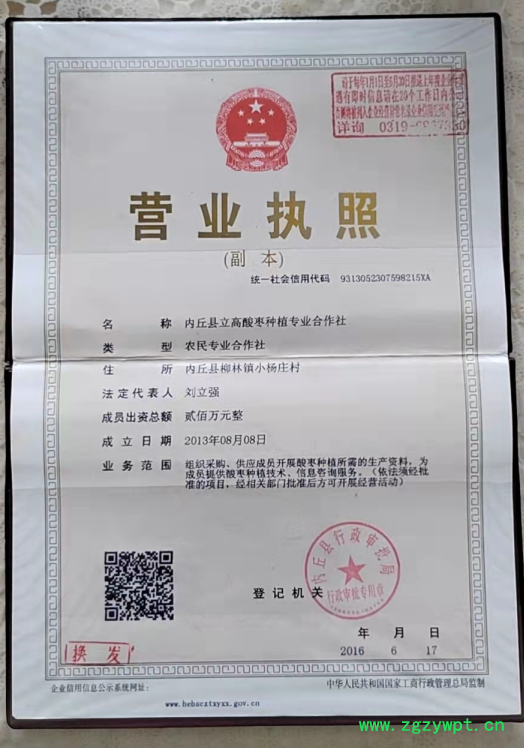 欢迎,各位朋友,来店广临,交天下朋友。内丘县立高酸枣种植专业合作社,成立于2013-08-08,注册资本为200万人民币,法定代表人为刘立强,经营状态为存续,工商注册号为130523NA000269X,注册地址为内丘县柳林镇小杨庄村,经营范围包括组织采购、供应成员开展酸枣种植所需的生产资料,为成员提供酸枣种植技术、信息咨询服务。(依法须经批准的项目,经相关部门批准后方可开展经营活动)