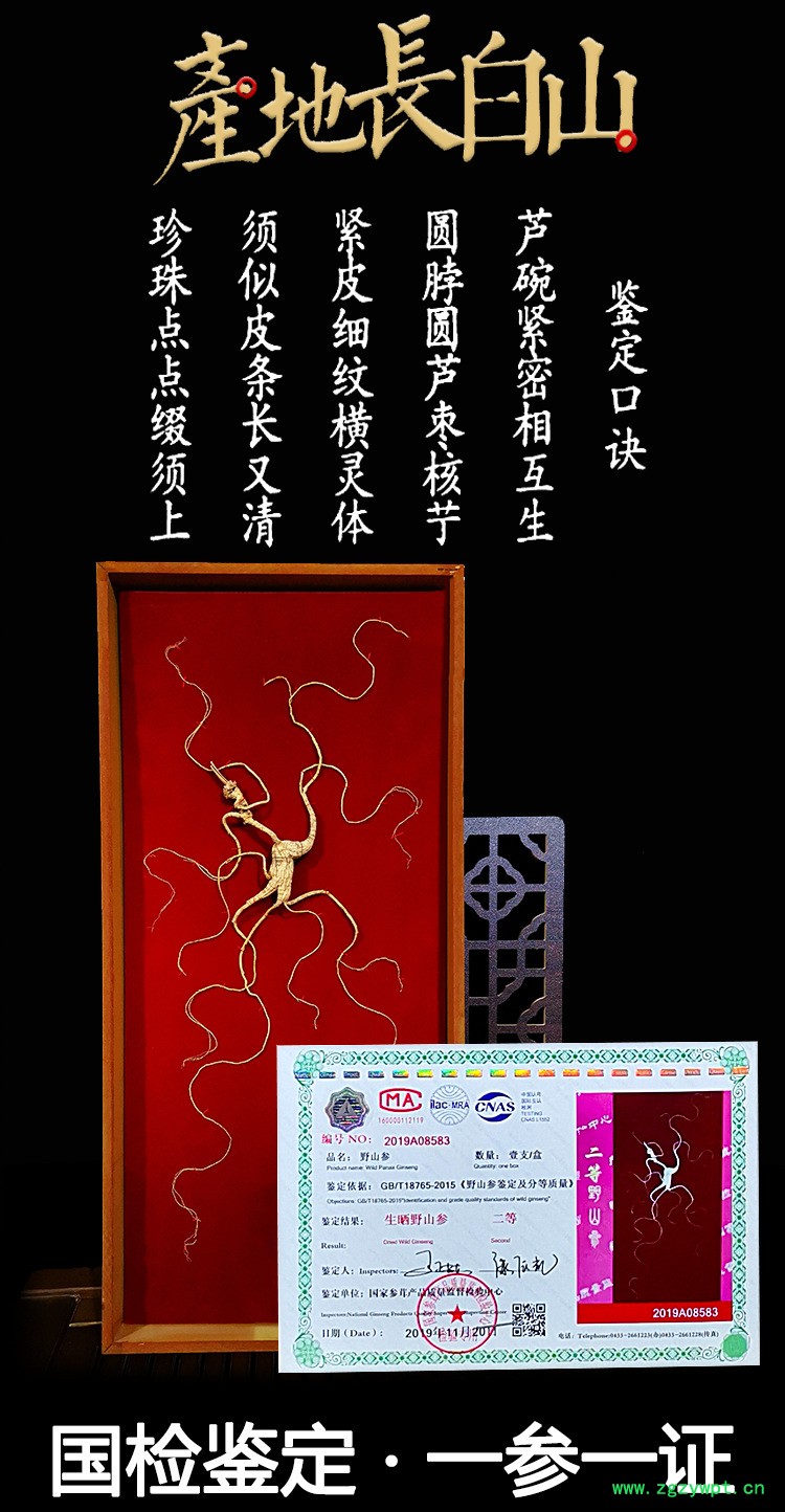 本款山参是经《国家参茸产品质量监督检验中心》权威机构监测 .此证书 带钢印 带防伪码 可追溯 权威官网网站可查询 一参一证.