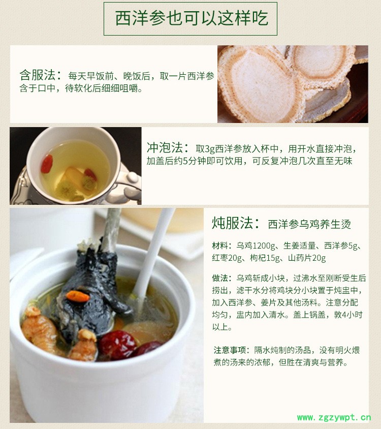 5、冲服法 将西洋参用小火拱干,研成细粉,每次取5克置杯中,加入少量蜂蜜,用开水冲入,加盖后5分钟,可分数次服用,以空腹饮用为佳。