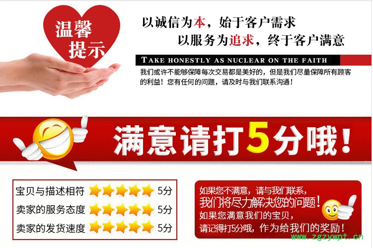 ![]() | 评分 | 我们用心经营着自己的店铺,及其重视您的评价,总是要求能做到更好,并跟买家结成友好的长期合作关系。如果 您收到货物后有什么不满意的,千万不要 不吭声就给出中 差评哦。因为一个中差评对我们双方都不是解决问题的办法。也不能让您由不满意变成满意哦! 谢谢亲们给予的大力支持!^_^ |