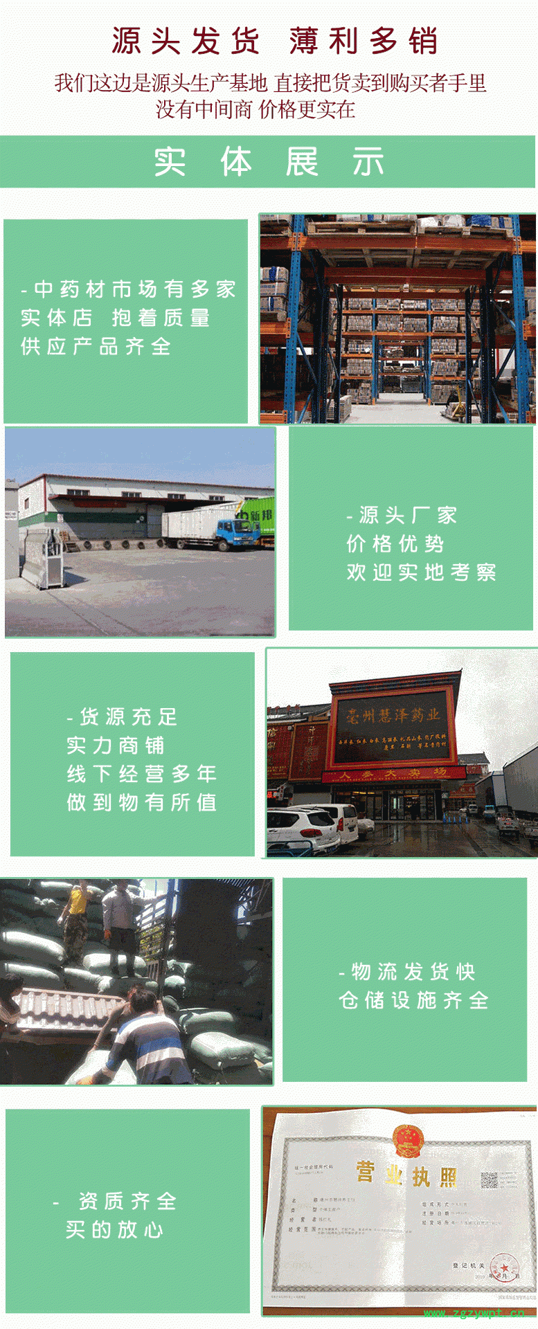 亳州市慧泽养生馆 主要生产 茯苓.芡实.黄芪、丹参、当归、当参、甘草、桑葚、枸杞、八角、花椒、小茴香、陈皮、干姜、砂仁、三七、红参、白参、燕窝、藏红花、阿胶.红枣姜茶、三七粉、西洋参粉、菊花、玫瑰花等中药材 畅销消费者市场,在消费者当中享有较高的地位,公司与多家零售商和代理商建立了长期稳定的合作关系。