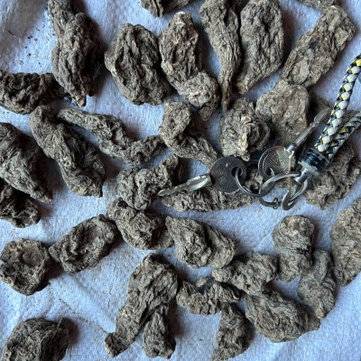 本品为不规则的块片、碎块,大小、厚薄不一。表面乌黑色,有光泽,黏性大。