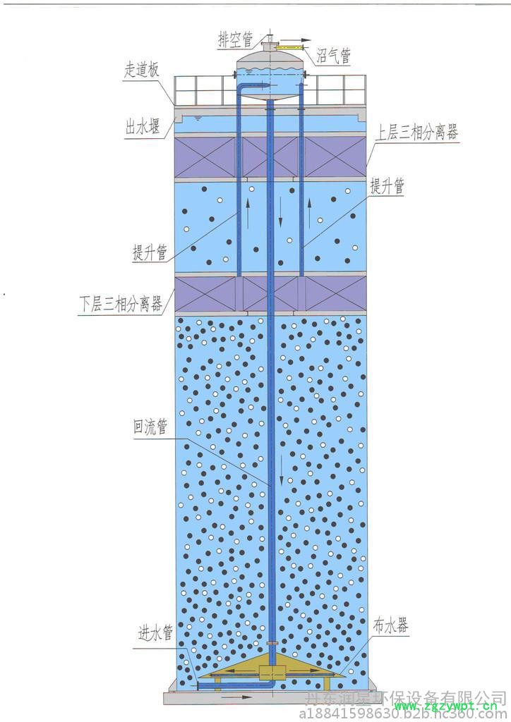 气液分离区:被提升的混合物中的沼气在此与泥水分离并导出处理系统,泥水混合物则沿着回流管返回到**下端的混合区,与反应器底部的污泥和进水充分混合,实现了混合液的内部循环。