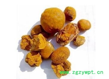 牛黄  是脊索动物门哺乳纲牛科动物牛胆囊的胆结石。在胆囊中产生的称“胆黄”或“蛋黄”,在胆管中产生的称“管黄”,在肝管中产生的称“肝黄”。牛黄完整者多呈卵形,质轻,表面金黄至黄褐色,细腻而有光泽。
