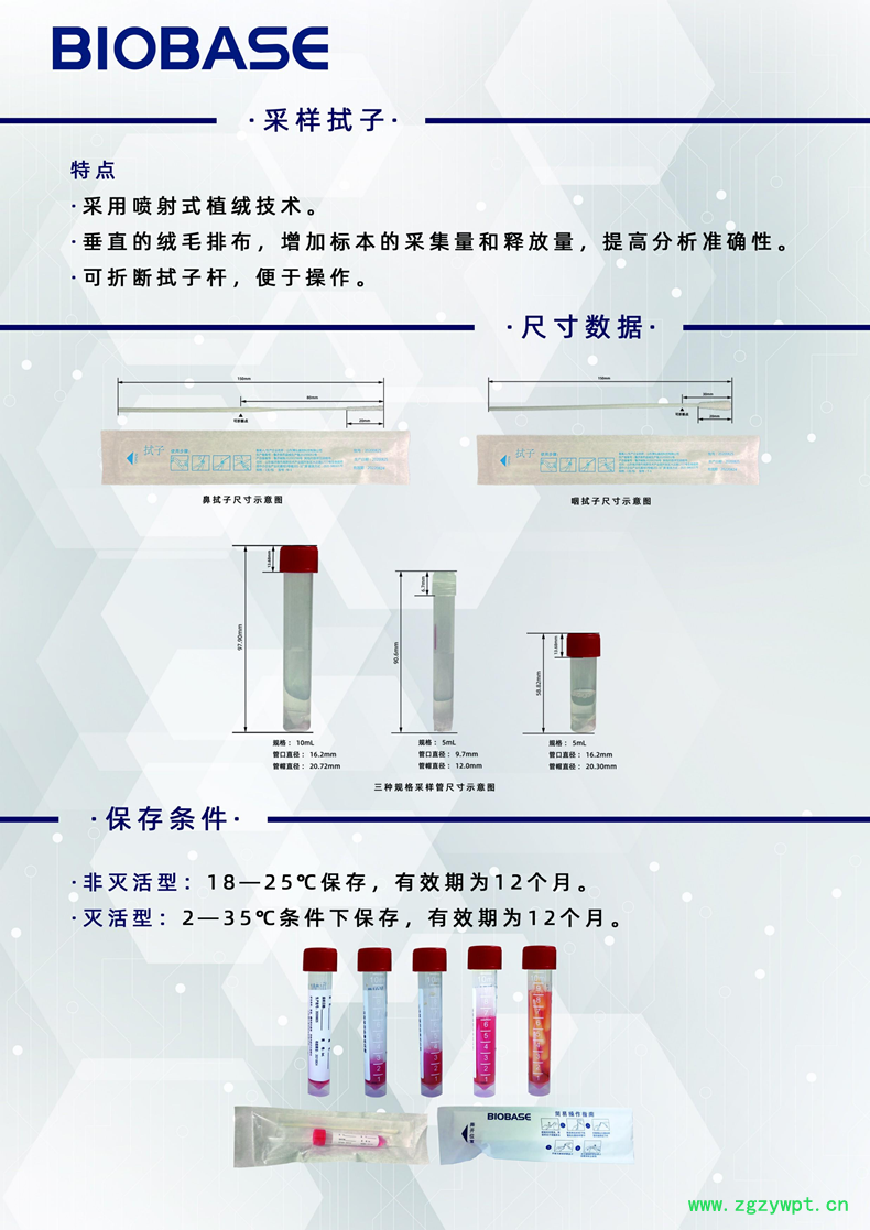 ②拭子:采样头为植绒材质,拭子杆为聚丙烯材质。