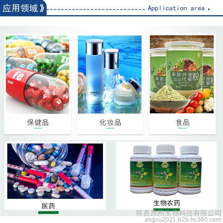 【应用领域】:功能性食品原料、固体饮料、代餐粉、植物源农药、化妆品**饲料添加剂等。