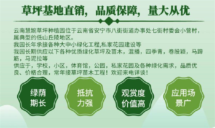 | 类型 | 天鹅绒草坪 市政绿化草坪 学校绿化草坪 园林绿化草坪 私家花园草坪 百慕大草坪 台湾2号草坪 |