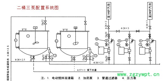 三、系统组成: 如图所示是按照两桶三泵的一套加药装置.