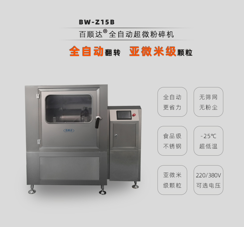 我公司生产的“百顺达”牌“BW”系列超微粉碎设备具有智能化控制.超微粉碎产量大、细胞破壁率高、超低温粉碎.全密闭无损耗.无粉尘溢出.高糖高油高纤维作业等优良突出的特点。超微粉碎的粉体粒径可达1~0.1μm,细胞破壁(膜)率达98%以上