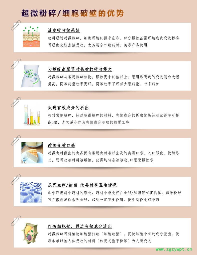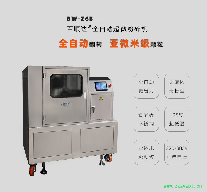 我公司生产的“百顺达”牌“BW”系列超微粉碎设备具有智能化控制.超微粉碎产量大、细胞破壁率高、超低温粉碎.全密闭无损耗.无粉尘溢出.高糖高油高纤维作业等优良突出的特点。超微粉碎的粉体粒径可达1~0.1μm,细胞破壁(膜)率达98%以上