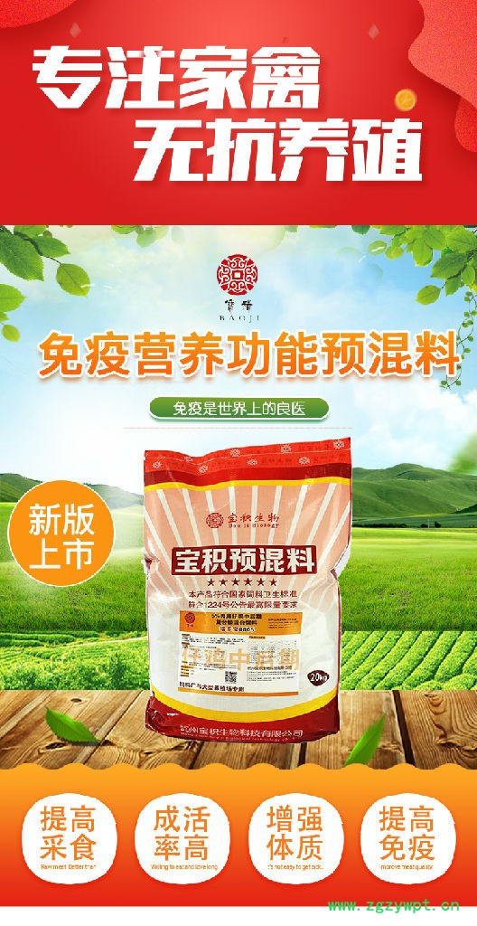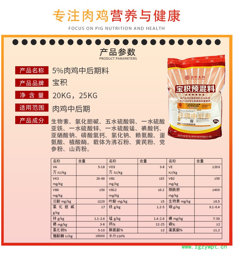 【肉用仔鸡中后期预混料性状】本品为黄色、黄棕色、黄褐色或棕色粉末【肉用仔鸡中后期预混料原料组成】饲料级维生素(A、D3、E、K3、B1、B2、B6、B12)、泛酸、生物素**、饲料级微量元素(铜、铁、锌、锰、碘、硒)、钙、磷、氯化钠、赖氨酸、蛋氨酸、植酸酶。载体为沸石粉、黄芪粉、党参粉、山药粉。【肉用仔鸡中后期预混料主要功能】1、全面补充营养,促进生长发育,缩短养殖周期2、促进肠道消化吸收,提高饲料消化利用率,提高生长速度。3、促进脂肪的乳化吸收、增进机体健康。4、调节食欲,促进采食,提高日增重。【肉用仔鸡中后期预混料适用范围】肉用仔鸡中后期【肉用仔鸡中后期预混料使用说明】推荐用量: 按饲料的5%比例拌料,不得直接饲喂。注意事项: 本品不作为临床药物使用,动物免疫程序和卫生防疫程序照常进行。要注意保温、通风、科学管理、保持饲养环境良好和正确的饲养方式。【贮存条件及方法】密封,阴凉干燥处保存【净 含 量】20kg【保 质 期】4个月【卫生要求】本产品符合饲料卫生标准GB 13078的规定。【生产者名称】 杭州宝积生物科技有限公司 【注册地址】浙江省杭州市余杭区余杭街道义桥村【生产地址】浙江省杭州市余杭区余杭街道义桥村新庵前100号【邮政编码】311121
