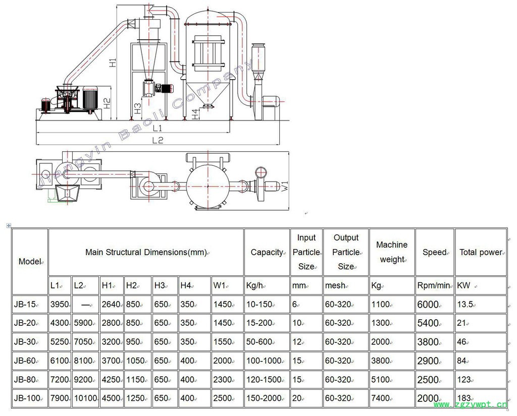 物料由料斗经螺旋输送器进入粉碎室,被高速旋转的刀片剪切粉碎,粉体越过导向圈进入分级室,因分级轮是旋转的,流入叶道内的粉体同时受到空气动力和离心力的左右。粉体中大于临界直径(分级粒径)的颗粒因质量大,被甩回粉碎室继续粉碎,小于临界直径的颗粒通过负压风运的方法经出料管进入旋风分离器、袋式除尘器,排出物料达到产品的要求。