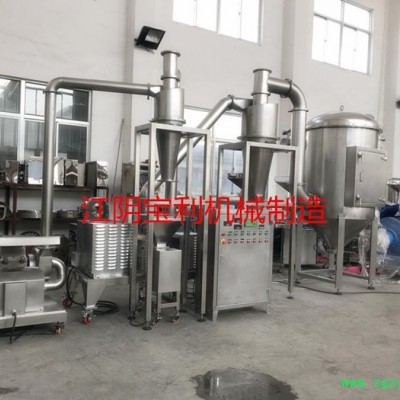 设计紧凑,相较于微粉碎机组,多加前道工序锤片进行粗粉碎,使得大颗粒物料能直接进行细粉碎,粉碎过程连续,无粉尘。粉尘捕集袋截留的细粉能有效回收,降低了物料的损耗率。