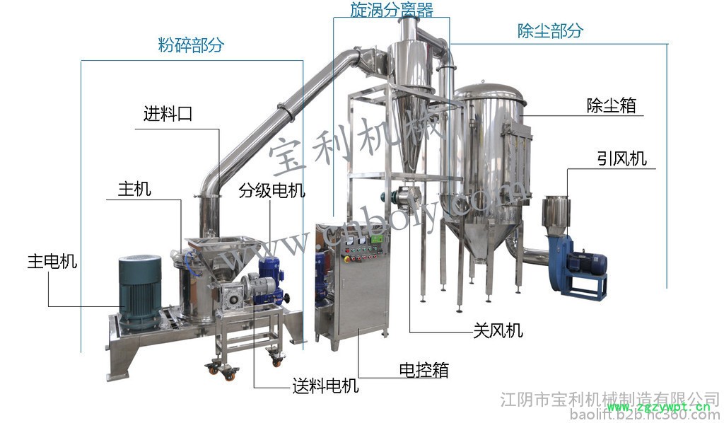 2, 粉碎机主机的分级叶轮可以通过分级电机调节速速,调节速度的快慢达到需要粉末颗粒的大小。无需再用筛网来控制粉末颗粒的大小。