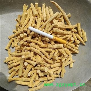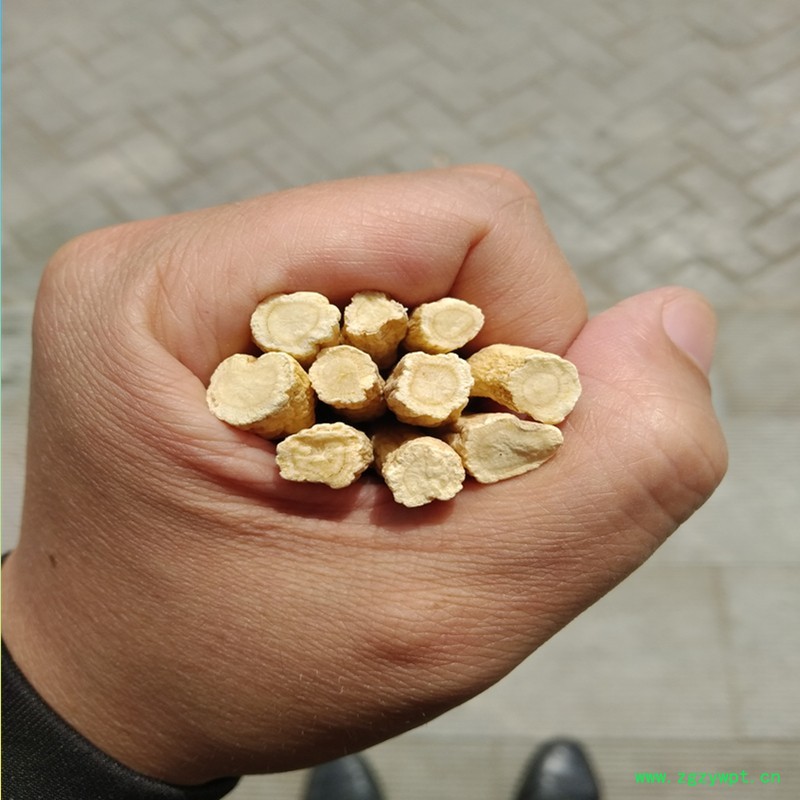 [性 状]:本品呈纺锤形、圆柱形或圆锥形,长2~8cm,直径0.5~2cm。表面浅黄褐色或黄白色,可见横向环纹及线状皮孔,并有细密浅纵皱纹及须根痕。断面平坦,浅黄白色,略显粉性,皮部可见黄棕色点状树脂道,形成层环纹棕黄色,本部略呈放射状纹理。气微而特异,味微苦、甘。