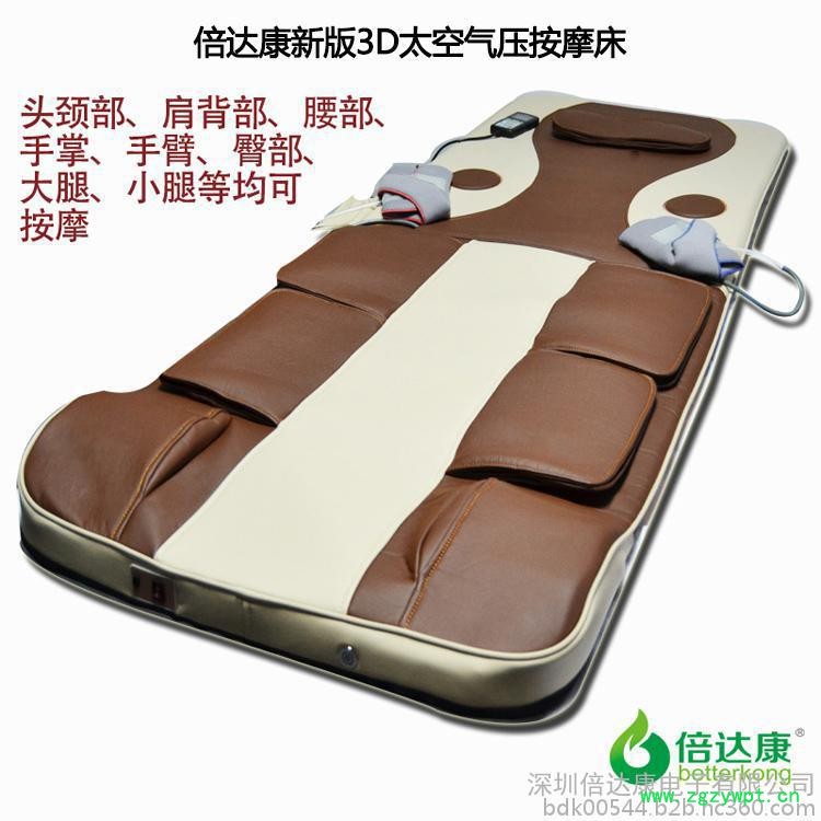 气压按摩是一种新型的按摩方式,是通过气囊的充气放气过程来挤压或者拉伸人体穴位达到按摩放松的效果。倍达康3D太空气压按摩床采用多组气囊,通过单点充气放气以及组合充气放气的过程达到挤压按摩,腰背角拉伸,扭腰扭脖子,提臀抬腰等按摩效果,气囊按摩相比传统的机械按摩方式会更柔和,不会因硬物戳在身上感觉不舒服,更轻柔舒适。本产品采用**PU皮材料,类似于汽车座椅,通气性很好,全家都能使用。特别是对一些久坐久卧行动不是很方便的家人,可以通过按摩放松锻炼脊骨和身体各个部位,让全身各个部位动起来。工作了**回到家中,躺在按摩床上放松放松,凡尘俗世尽皆抛在脑后,管他功名利禄荣辱得失,身体健康心情愉快才是现代人追求的真正生活品质。