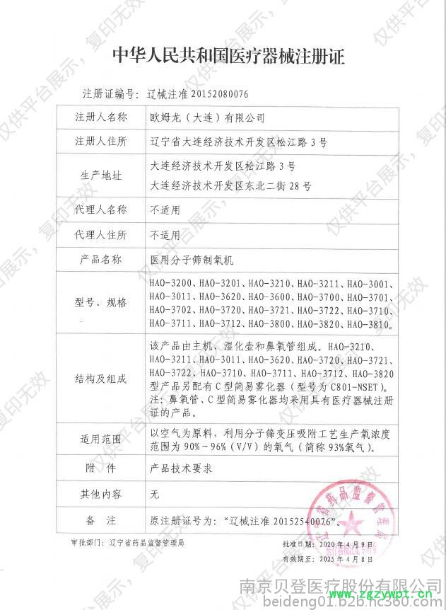 | 医疗器械注册证 | 辽械注准20152080076 |