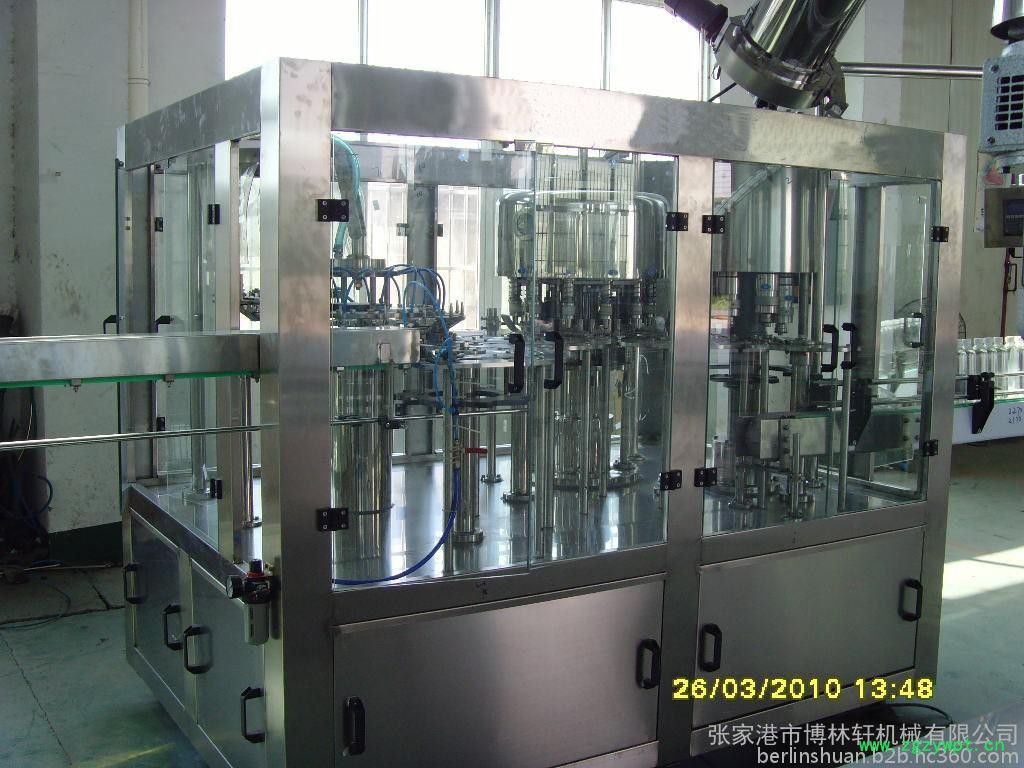该机集冲洗、灌装、旋盖为一体的全自动多功能联合机组,它适用于各种无气饮料、油醋、果酒、矿泉水、纯净水的自动冲洗、灌装、封口,该线设计独特、式样新颖、功能齐全、适应性强、操作使用方便、外形造型美观、自动化程度高,是目前**好灌装设备。