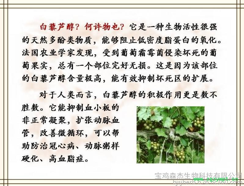9.减肥降脂作用: 因为白藜芦醇有着抗癌、抗氧化、抗炎、抗菌的作用而爱到人们的喜爱,植物来源中说到因为法国人常饮高脂肪物中含有白藜芦醇,所以法国人的冠心病发病率底于其它西方**,从此信息中可得知白藜芦醇因为有效地压制高脂肪的防治作用。已有部分**和地区把白藜芦醇及其制品作为膳食补充剂开发白藜芦醇。