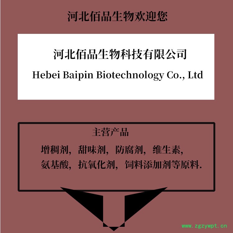 河北佰品生物科技有限公司经销批发的食品添加剂、增稠剂、甜味剂、酸味剂、乳化剂、抗氧化剂、营养强化剂、防腐保鲜剂畅销消费者市场,在消费者当中享有较高的地位,公司与多家零售商和代理商建立了长期稳定的合作关系。河北佰品生物科技有限公司经销的食品添加剂、增稠剂、甜味剂、酸味剂、乳化剂、抗氧化剂、营养强化剂、防腐保鲜剂品种齐全、价格合理。河北佰品生物科技有限公司实力雄厚,重信用、守合同、保证产品质量,以多品种经营特色和薄利多销的原则,赢得了广大客户的信任。
