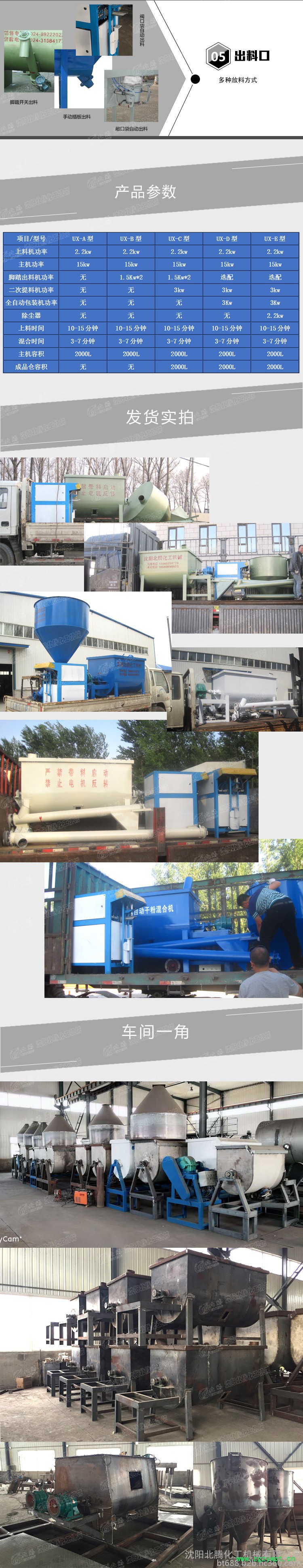 UX型干粉混合机的标准配置是:2.2kw螺旋粉料提料机,7.5kw的新矩型双螺带主机,日产量10吨左右。