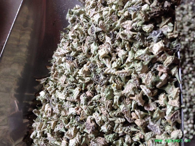 形状:本品背部黄绿色,隆起,有纵棱及多数小刺,并有对称的长刺和短刺各1对,两侧面粗糙,有网纹,灰白色。质坚硬。味苦、辛。