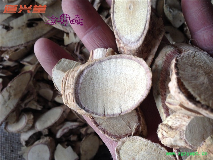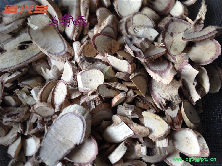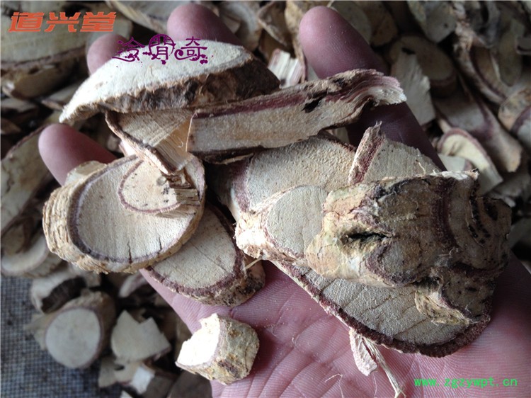 [性 状]:该品圆柱形,长短不一,直径且1.5-2.5cm;或已切成圆形厚片。外皮黄色或橙红色,具显著的纵皱纹及少数须根痕。栓皮薄而易脱落。质地坚硬,不易折断,断面皮部薄,灰黄色,具韧性纤维,木部占绝大部分。黄色,柴性,导管孔明显,有的中央部位有小髓。气微,味淡。