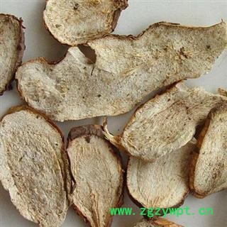 [性 状]:该品块根长圆形或纺锤形,多纵切成瓣或斜片。完整者长5-12cm,直径1.5-3.5cm。表面红棕色或红褐色,有纵皱纹、细横纹及横长皮孔,栓皮易层层脱落,脱落处显淡红棕色,剖面类白色或淡红棕色,皱缩不平。斜片呈卵圆形,长2.5-5cm,宽2-3cm,切面类白色或浅红棕色,可见放射状纹理,周边较厚,微翘起或略弯曲。体轻,质硬脆,粉性。气微,味微甜。以肥大、断面粉红色、粉性足者为佳