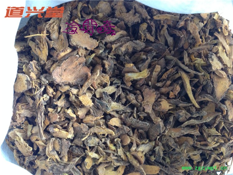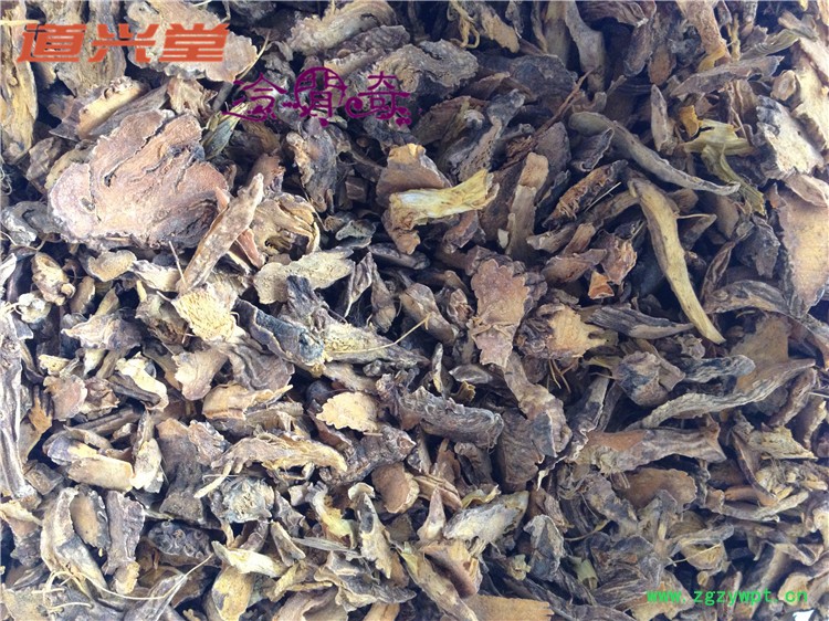 [性 状]:该品根圆柱形,略扭曲状弯曲,长18-22cm,直径0.5-2cm。有时可见侧生支根或支根痕。表面棕褐色,具明显纵皱。顶端有圆柱状根茎或其残基。质坚,稍脆,折断面平整,略具粉质。横断面形成层环明显,皮部淡黄色,木部棕黄色或带粉红色,呈显著放射状排列。气徽,味微苦涩。