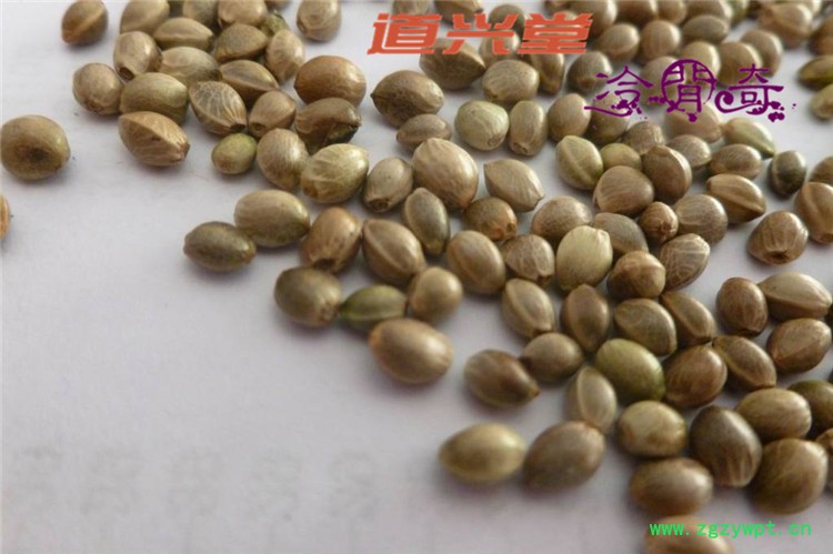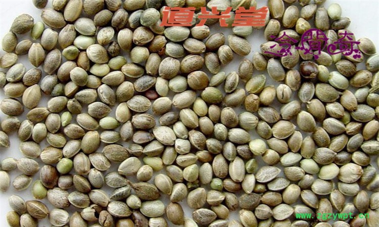 [性 状]:该品大麻干燥果实呈扁卵圆形,长4~5毫米,直径3~4毫米。表面光滑,灰绿色或灰黄色,有微细的白色、棕色或黑色花纹,两侧各有1条浅色棱线。一端钝尖,另端有一果柄脱落的圆形凹点。外果皮菲薄,内果皮坚脆。绿色种皮常粘附在内果皮上,不易分离。胚乳灰白色,菲薄;子叶两片肥厚,富油性。气微,味淡。以色黄、无皮壳、饱满者佳。
