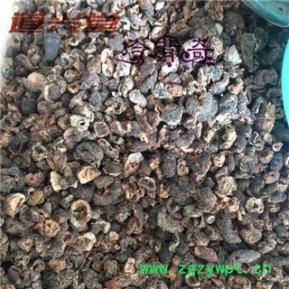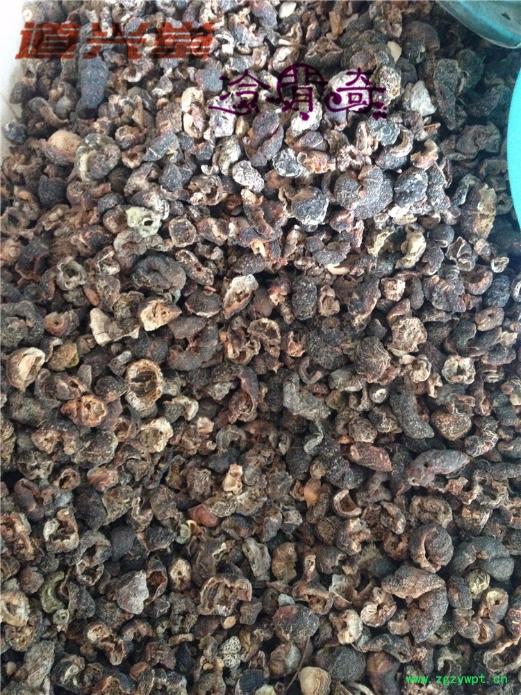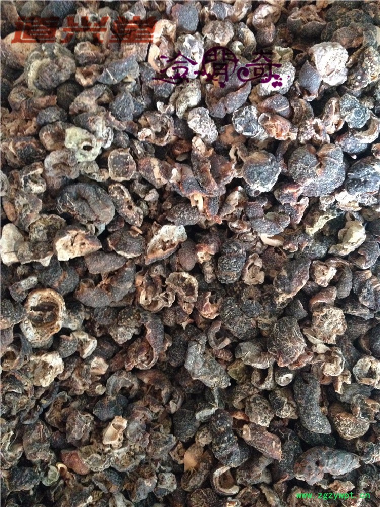 [性 状]:该品果实球形或扁球形,直径1.2-2cm。表面棕褐色至墨绿色,有淡黄色颗粒状突起,具皱纹及不明显的6棱,果梗长约lmm,果肉(中果皮)厚1-4mm,质硬而脆。内果皮黄白色,硬核样,表面略具6棱,背缝线的偏上部有数条维管束,干后裂成6瓣。种子6颗,近三棱形,棕色。气微,味酸涩,回甜。以个大、肉厚、回甜味浓者为佳。