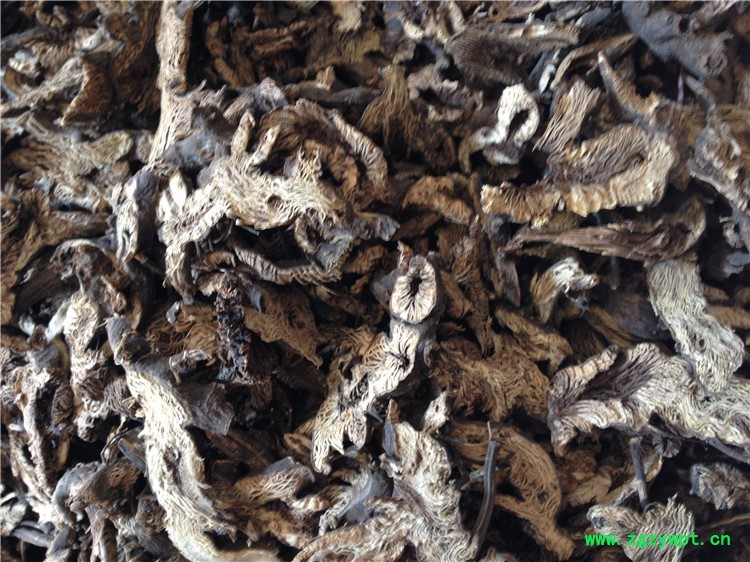 [性 状]:该品不规则长方状,多短分枝或结节状,长8-20cm,直径1.5-2.5cm;表面暗棕色或黑棕色,有时皮部脱落而露出网状的筋脉,上侧有多个大型茎基,长1.5-3cm,直径0.5-2.5cm,两侧及下侧有少数细根断痕;质坚硬而轻,断面黄白色,皮部菲薄,木部呈放射状或网状条纹(纵切面),髓朽蚀成空洞。气微,味微苦。