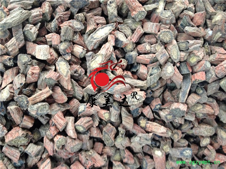 [性 状]:该药材丹参多为带根茎的根,根茎粗短,有茎基残余,下着生多数细长的根。根呈圆柱形,稍弯曲,表面呈砖红色,粗糙,具多数纵沟或皱纹,有须根痕,外部栓皮常鳞片状剥落,皮层有时开裂,长8~22cm,直径5~12mm,质坚脆,易折断,断面不平,疏松有裂隙,皮部棕渴色或砖红色,韧皮部狭。形成层明显,淡棕色,木质部导管束灰黄色或黄白色,放射状排列。气微,味微苦、涩,以条粗壮、色紫红者为佳。