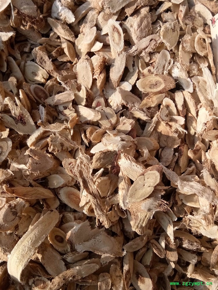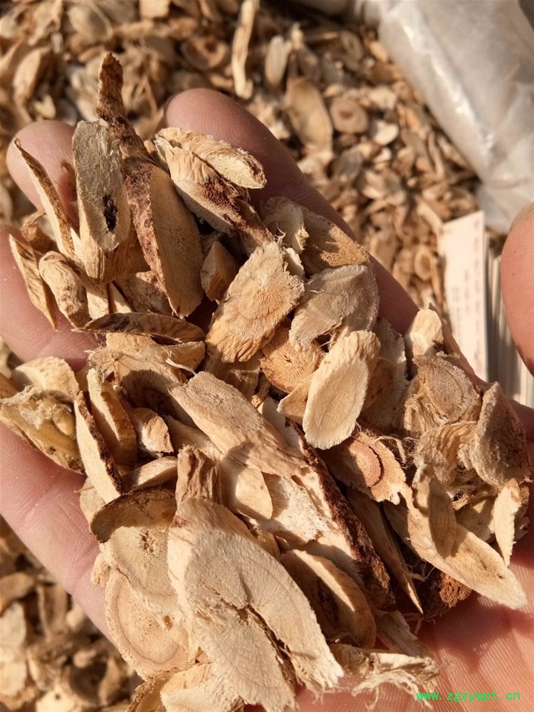 [性 状]:本品黄芪直根圆柱形、有的有分枝,上端较粗,长30~90厘米,直径1~3.5厘米,表面纵皱色淡棕黄色或淡棕褐色,有不整齐的纵皱纹或纵沟质,硬而韧有粉性,皮部黄白较疏松;木部菊花纹理状,气似豆腥味微甜。老根中心偶有枯朽状,黑褐色或呈空洞。气微,味微甜,嚼之微有豆腥味。