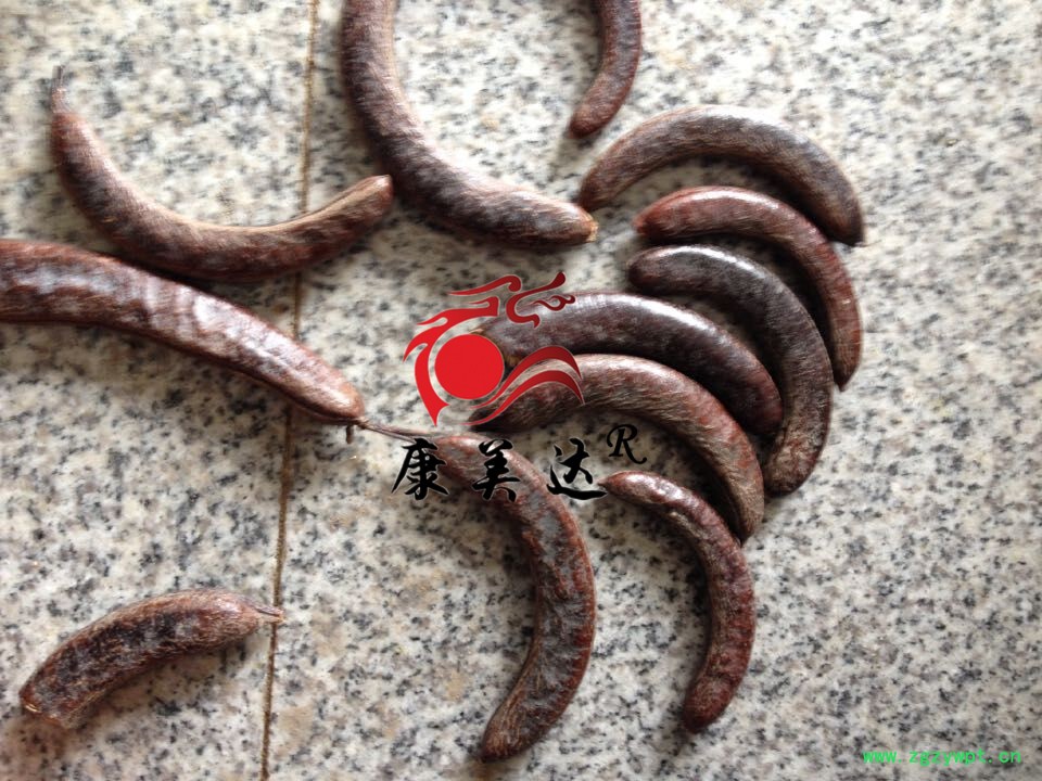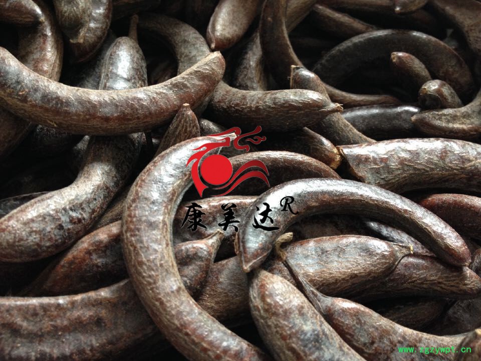 性状:干燥荚果呈圆柱形,略扁,弯曲作镰形,长5~10厘米,宽5~12毫米。表面紫棕色或紫黑色,被灰白色粉霜,擦去后有光泽,并有细小的疣状突起及线状裂纹,腹缝线突起呈棱脊状,背缝线突起不显著而有棕黄色纵纹。先端有喙状的花柱残基,基部有果柄残痕。质硬而脆,易折断,断面外层棕黄色,中间黄白色,中心较软,有淡绿或淡棕黄色的丝状物与斜向网纹,纵向剖开可见排列整齐的凹窝,很少见种子。臭微,有刺激性,嗅其粉末则作喷嚏,味先甜后辣。以个小饱满、色紫黑、有光泽、无果柄、质坚硬、肉多而粘、断面淡绿色者为佳。