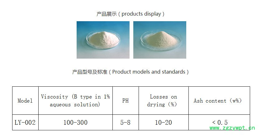结构式:C6H7O2(OH)2OCH2COONH4分子式:C8H15O7N,外观纯品为白色粉末或微黄色纤维状粉末或颗粒,易溶于水、碱水溶液、氨和纤维素溶液,不溶于有机溶液、矿物油的无色无定型物。