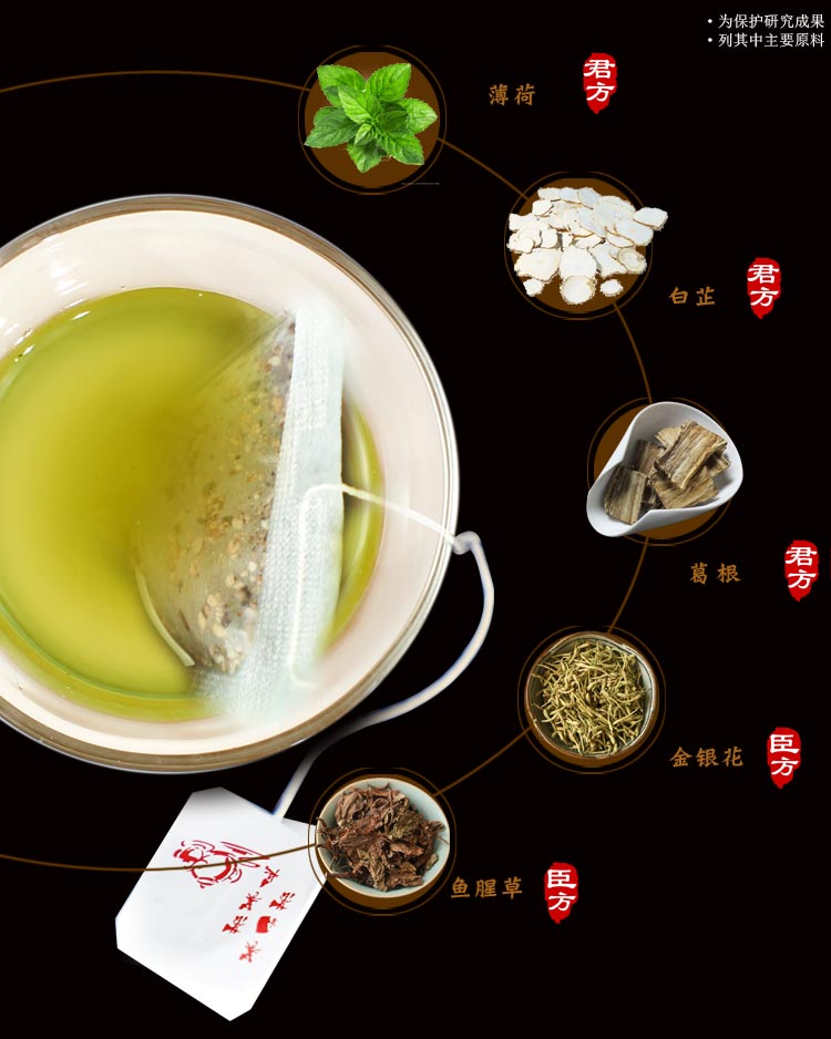 | 原料与配料 | 薄荷、白芷、葛根、甘草、栀子、桔梗、金银花、淡竹叶、鱼腥草 |