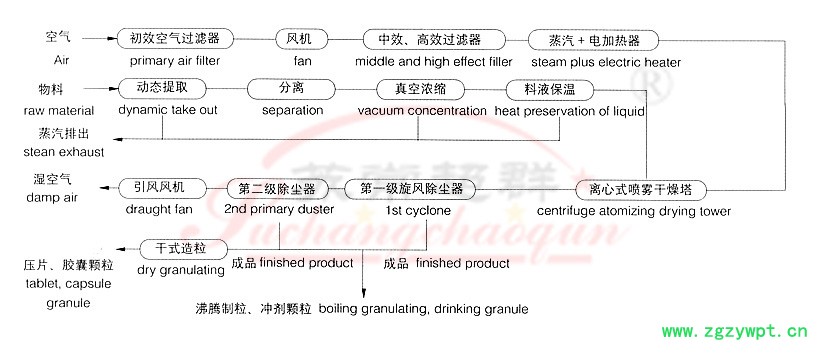 中药浸膏专用喷雾干燥机是我厂消化吸收国外新技术而开发的新产品,该机适用于熔点低、含糖高的中成药产品,并具有不粘壁、不易吸潮等特点。该装置根据干燥产品的特点和性质确定喷雾干燥的工艺条件,自动化程度高,操作方便,符合GMP要求。工艺参数的计算与确定全部由计算机完成,该装置的成功开发,解决了多年来许多熔点低、含糖高的中药产品不能用喷雾干燥的技术难点,也是对喷雾干燥在中药制药工业中的应用技术研究的新发展。