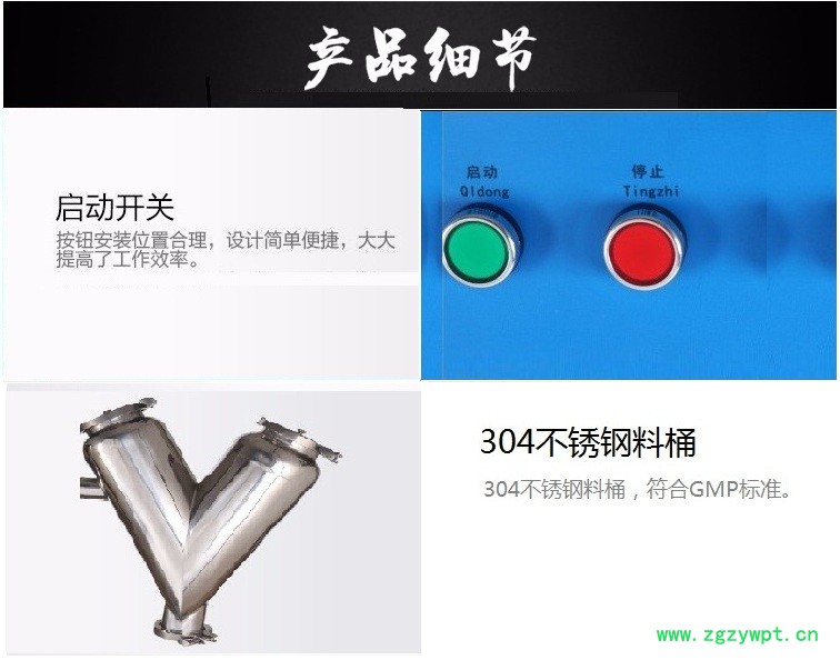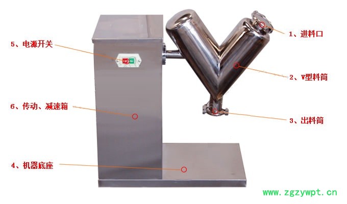 V型混合机又称不对称混合机或二维混合机,它是通过电机带动减速机、转轴,转轴连接V型料筒,料筒通过转轴做圆形运动,带动料筒内的物料在桶内上、下、左、右运动,从而使物料混合。该机主要由不锈钢制造,符合GMP标准,适合医药、食品、工业等多行业流动性较好的干性粉状或颗粒状物料的混和。本机结构合理,操作简单,进出料方便,便于清洗,实用性较高。