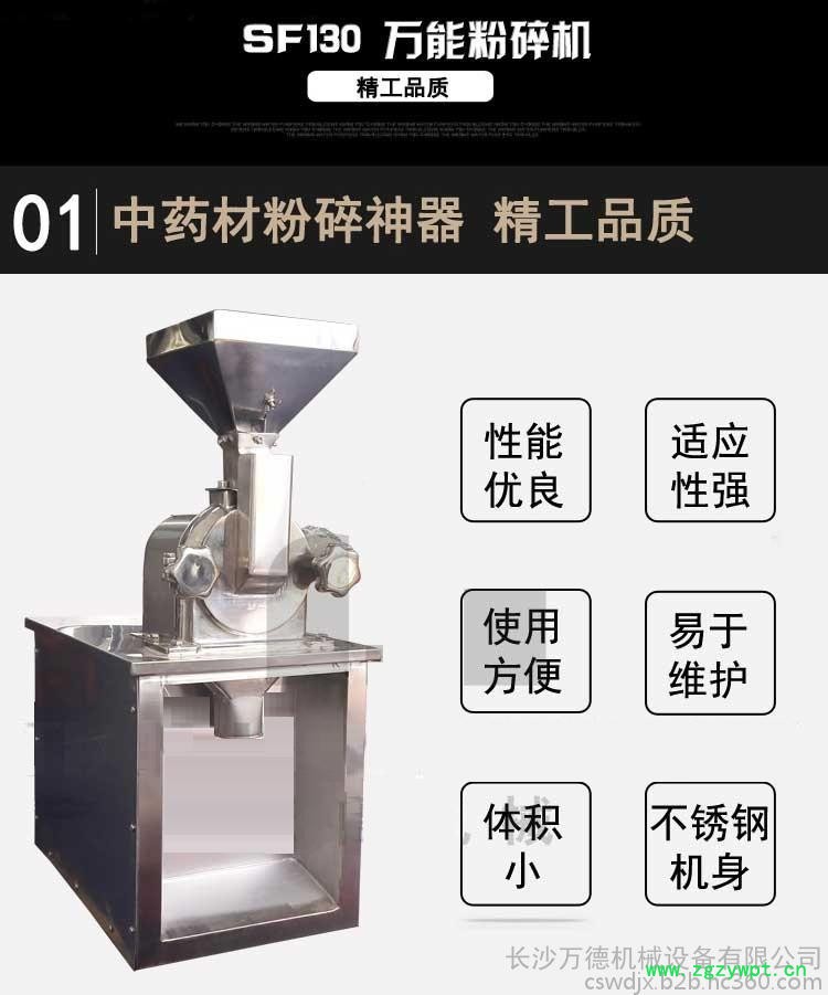 本机结构简单、坚固、运转平稳、粉碎效果良好,被粉碎物可直接由主机磨腔中排出、粒度大小通过更换不同孔径的网筛获得,另外该机为全不锈钢。机壳内壁全部经机加工达到表面平滑,改变了以前机型内壁粗糙、积粉的现象,使药品、食品、化工等生产更符合国家标准,达到GMP的要求。