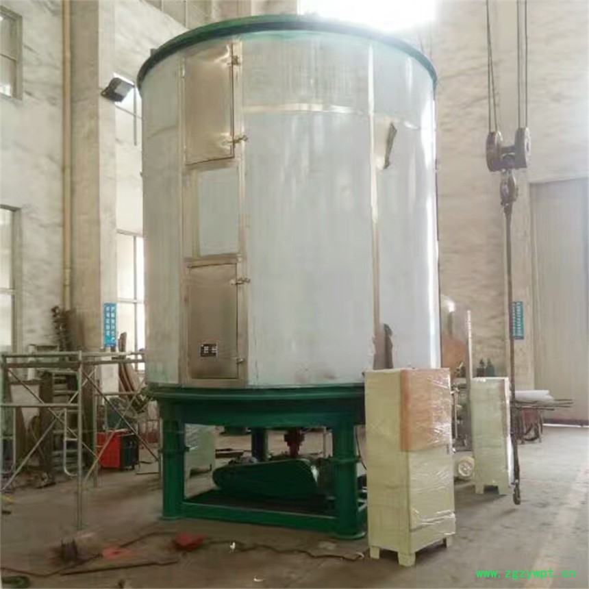 湿物料自加料器连续地加到干燥器上部一层 干燥盘上 ,带有耙叶的耙臂作回转运动使耙叶连续地翻抄物料 。物料沿指数螺旋线流过干燥盘表面 ,在小干燥盘上的物料被移送到外缘 ,并在 外缘落到下方的大干燥盘外缘,在大干燥盘上物料向里移动并从中间落料口落入下一层小干燥盘中 。大小干燥盘上下交替排列 ,物料得以连续 地流过整个干燥器。中空的干燥盘内通入加热介质 ,加热介质形式有饱和蒸汽 、热水和导热油 ,加热介质由干燥盘的一端进入,从另一端导出 。已干物料从一层干燥盘落到壳体的底层 ,被耙叶移送到出料口排出 。湿份从物料中逸出 ,由设在顶盖上的排湿口排出,真空型盘式 干燥器的湿气由设在顶盖上的真空泵口抽出 。从底层排出的干物料可直接包装 。通过配加翅片加热器 、溶剂回收冷凝器、袋式除尘器、干料返 混机构、引风机等辅机,可提高其干燥的生产能力,干燥膏糊状和热敏性物料,可方便地回收溶剂,并能进行热解和反应操作。