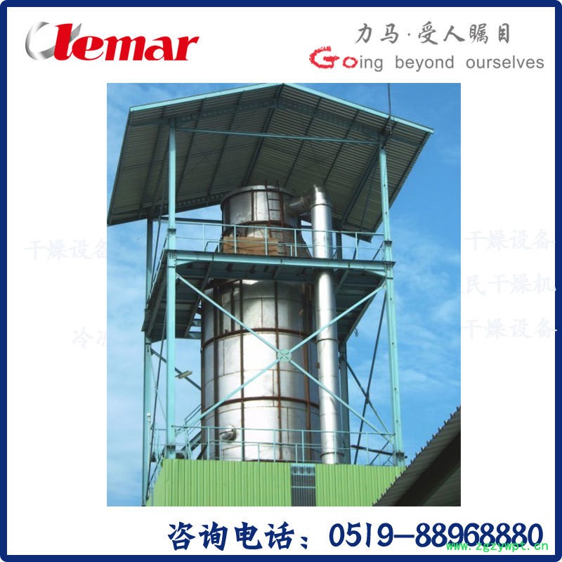 中药液喷雾干燥一步造粒的工艺流程为: 将定量干燥的辅助料颗粒加入螺旋给料入口, 由上部进入喷雾干燥塔, 经过过滤的空气经加热器加热后从干燥塔底进入; 热空气进入后将加入的干燥颗粒形成沸腾层, 辅助颗粒被加热到指定温度后启动空气压缩机, 药液在贮罐中被压缩空气加压后, 通过喷嘴与压缩空气混合雾化, 喷出的药液吸附在沸腾层的物料中; 同时, 开动搅拌设备不断地搅拌, 被热空气干燥的沸腾层的颗粒逐渐增加, 至出料口出料; 尾气由喷雾干燥塔顶经引风机排出。