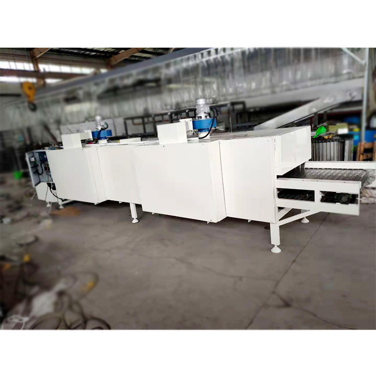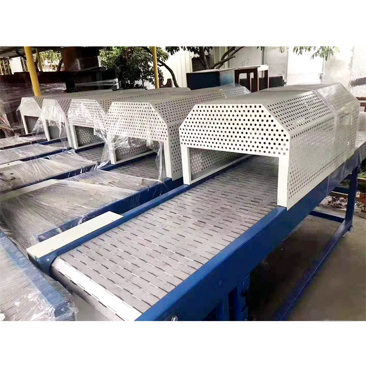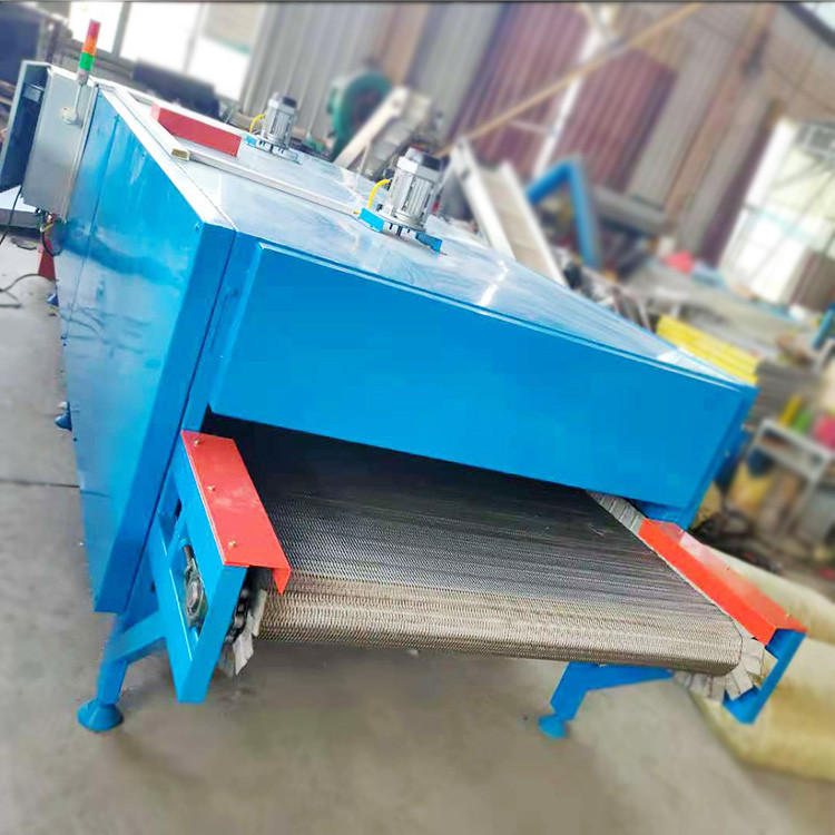 网带烘干机主要将压制的成品球通过输送机直接输送到平板输机上,通过平板输送机上端的刮板将成品球匀布在烘干机上,提高球的透气性,达到烘干效果。