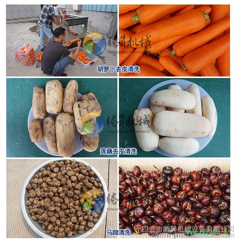 瓜果毛棍清洗脱皮机适用于圆形、椭圆形果蔬比如生姜、胡萝卜、山芋、土豆、红薯、等根薯类蔬菜的清洗、脱皮。