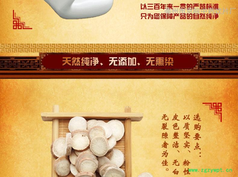 | 性状 | 本品呈类圆形的薄片。表面淡棕红色或类白色,平滑。切面类白色或微带棕红色,形成层环明显 |