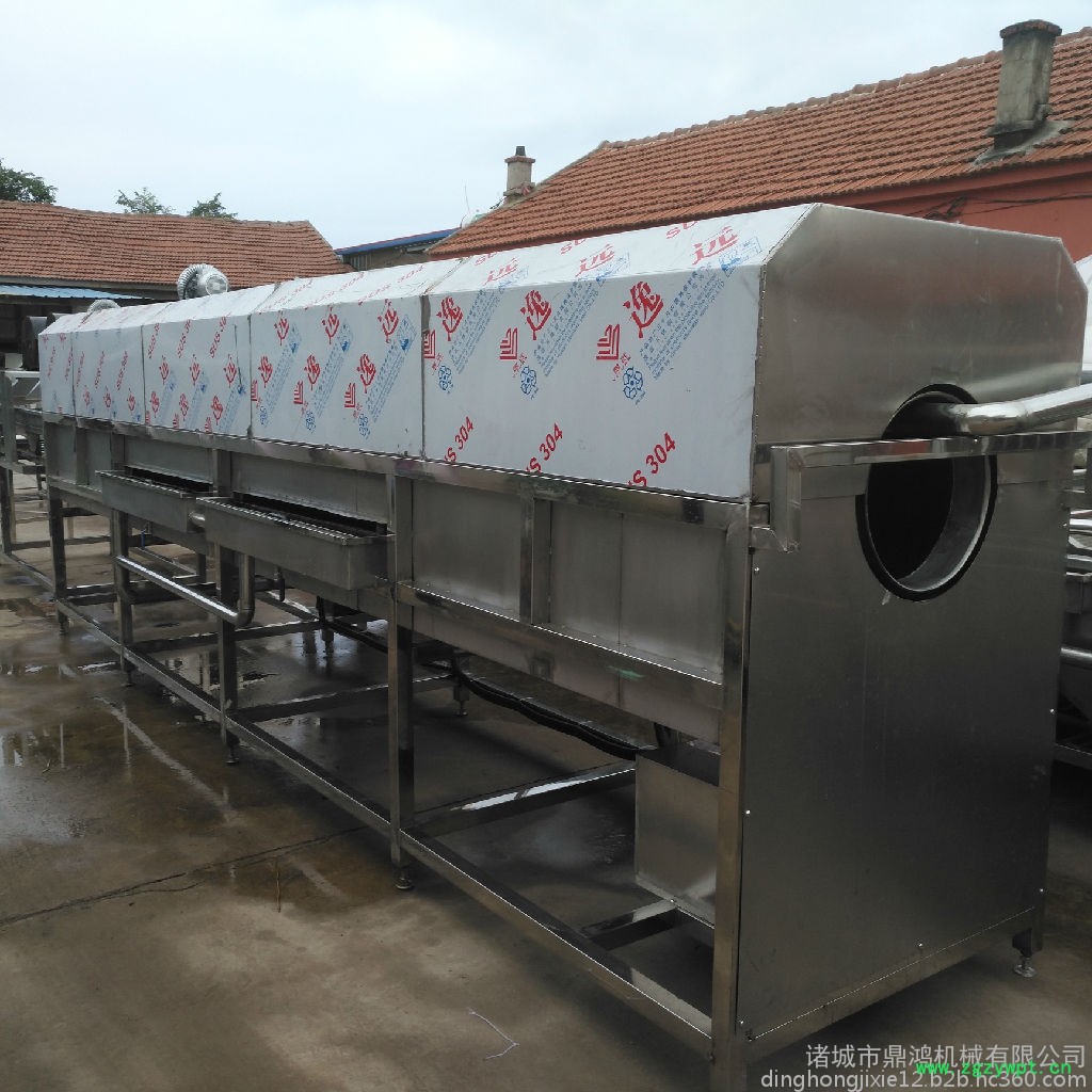 ?萝卜干清洗机 软包装袋去污清洗线,?该设备由减速机、水泵、滚筒、支架、托轮、喷淋水管、料斗、盖板、水箱、阀门、传动轴、电机架、电气控制开关等一些零部件组成。通过链条由电机链轮带动长轴上链轮,再由过渡轴的链轮和滚筒上的不锈钢链条啮合而使滚筒实现转动。物料进入滚筒后通过喷淋管冲洗以及滚筒翻转滚动达到清洗效果,滚筒下方有水箱,靠近进料的清水水箱,进水管接清水,靠近出料边有污水排出口。
