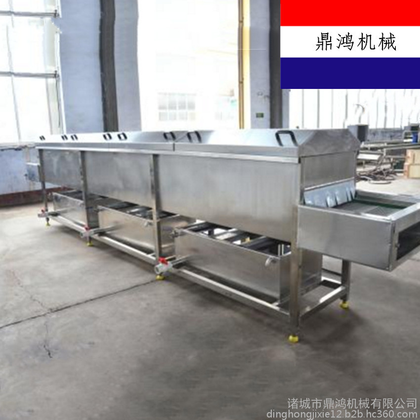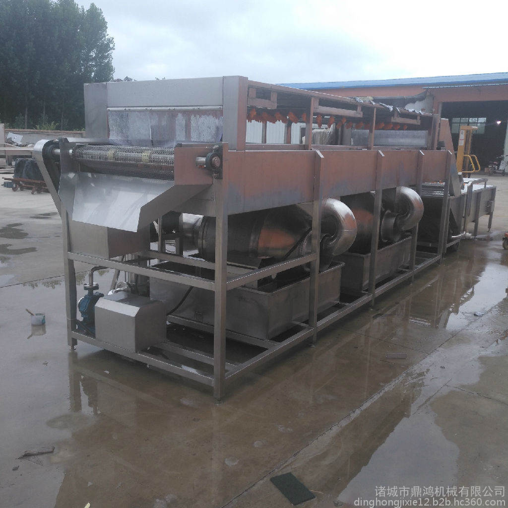 大姜先进入高压喷淋水槽,在高压喷淋水流下大姜被充分打散、翻滚、清洗、滚杠传送,从物料表面洗脱的泥沙沉入底部隔离仓,不会发生回流造成二次污染。大姜进入气泡清洗装置,漂浮在水中的杂物、小虫通过去杂机构清理掉,洗净的大姜由出水口再经喷淋清洗送至下道工序。该清洗机能有效去除大姜表面的污染物、农药,且对大姜损伤很小。有效的清除蔬菜表面的污染物而且可以缩短清洗时间,省时、省力、省水、洗洁净高、提高生产效率。