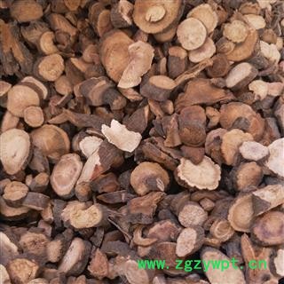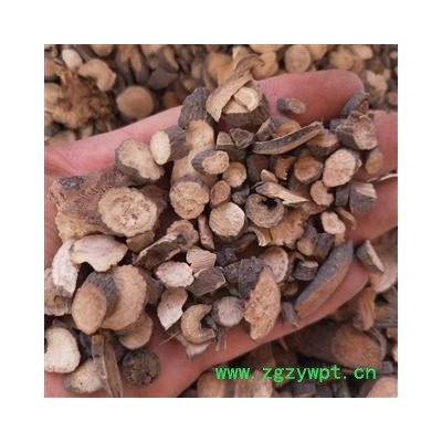 【性状】本品呈圆柱形,稍弯曲,长5~40cm,直径0.5~3cm。表面棕褐色,粗糙,有纵沟和皱纹,并有须根痕和横长的皮孔样突起,有的外皮易脱落。质硬而脆,易折断,断面粉白色或粉红色,皮部窄,木部放射状纹理明显,有的有裂隙。气微香,味微苦、酸涩。