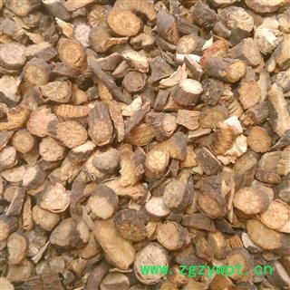 【性状】本品呈圆柱形,稍弯曲,长5~40cm,直径0.5~3cm。表面棕褐色,粗糙,有纵沟和皱纹,并有须根痕和横长的皮孔样突起,有的外皮易脱落。质硬而脆,易折断,断面粉白色或粉红色,皮部窄,木部放射状纹理明显,有的有裂隙。气微香,味微苦、酸涩。