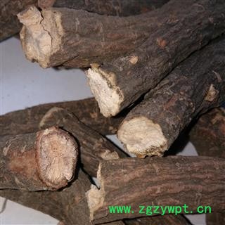 【性状】本品呈圆柱形,稍弯曲,长5~40cm,直径0.5~3cm。表面棕褐色,粗糙,有纵沟和皱纹,并有须根痕和横长的皮孔样突起,有的外皮易脱落。质硬而脆,易折断,断面粉白色或粉红色,皮部窄,木部放射状纹理明显,有的有裂隙。气微香,味微苦、酸涩。